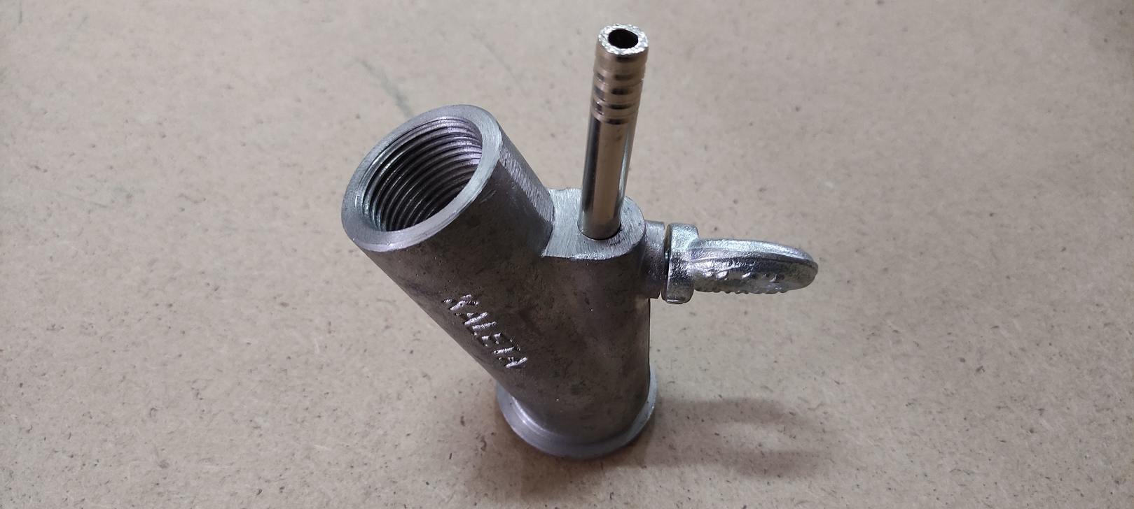 Сделан из алюминия. Состоит из стального винта с ручкой и латунного сопла.